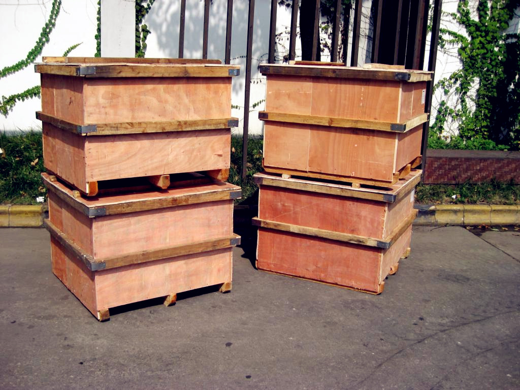 國內包裝箱含有箱板和固緊連接件,并且箱板通過固緊連接件構成相鄰箱板相互垂直的包裝箱,在每一個箱板外表面四周邊緣分別固定有一定數量的鋼卡釘連接件,相鄰箱板上的鋼卡釘連接件分別穿過位于該相鄰箱板垂直交接處的角鋼形連接件上設有的長條孔,并且其端部反向折彎固定,使相鄰箱板垂直固定連接,并構成包裝箱。
